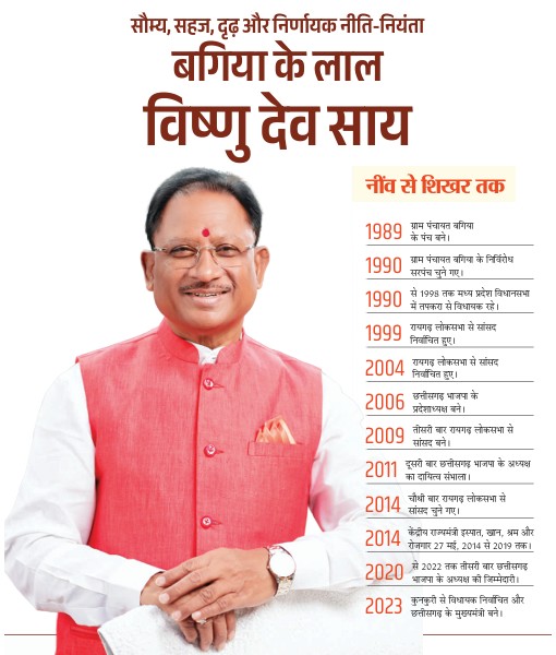 The central leadership of the Bharatiya Janata Party, which came to power with the resolve of good governance in the Chhattisgarh Assembly elections in the year 2023, has entrusted him with the important responsibility of the post of Chief Minister in view of Shri Vishnu Deo Sai's long political and administrative experience and his efficiency. Chief Minister Shri Sai is working with full commitment to fulfill the guarantees of Prime Minister Narendra Modi.